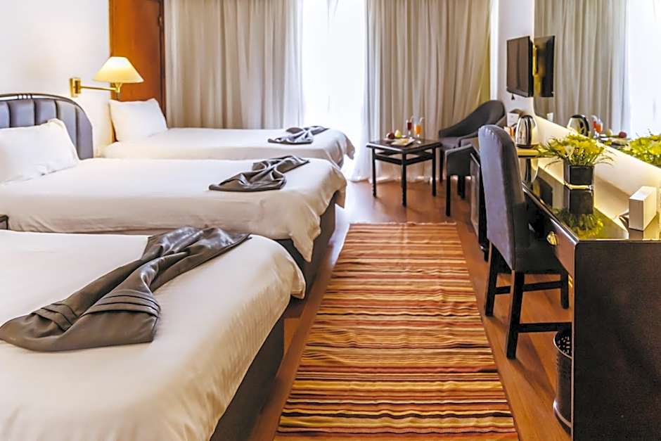 The spacious twin/double room features air conditioning, a mini-bar, a balcony with pool views as well as a private bathroom boasting a bath.